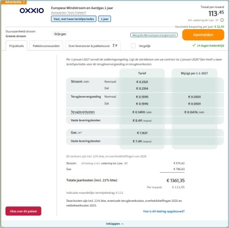 Bij de vergelijkingssites heb je een pulldown menu, waarin je de details van de aanbieding kunt vinden. We raden je aan om dat altijd te doen; wellicht is in jouw situatie het beter te kiezen op detail, b.v. als je veel of juist weinig gas gebruikt.